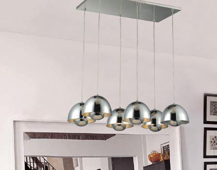 Lámpara colgante de seis luces con base rectángular. Diámetro de la tulipa cromada: 190mm. Lámparas 6 x G9. Consultar por alternativa con lámpara halopin. Acabado Exterior: Cromo, negro o rojo. Acabado Interior: Aluminio.